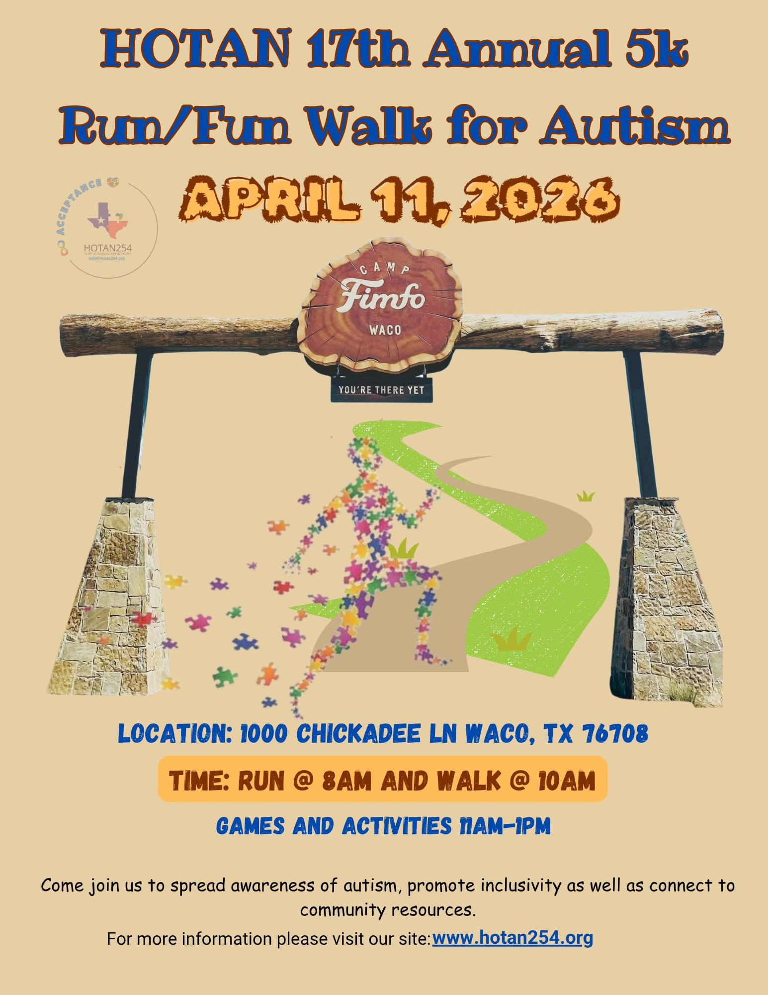 The Heart of Texas Autism Network (HOTAN) is a non-profit organization presenting the annual 5K Run for Autism at 8:00 am and Fun Walk for Autism at 10:00 am on Saturday, April 11, 2026. HOTAN is raising funds to support programs and activities that further the goal for individuals with Autism to have the opportunity to reach their full potential, share their talents and skills, and participate fully in our community. World Autism Awareness day is Thursday, April 2, 2026!